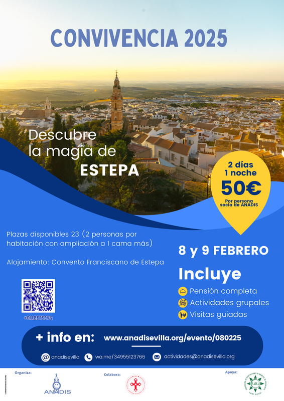 ANADIS celebra los próximos 8 y 9 de febrero (sábado y domingo) la tradicional convivencia de socios. Para este año, el lugar será Estepa con alojamiento en el Convento Franciscano de la localidad. Plazas disponibles 23 (2 personas por habitación con ampliación a 1 cama más, es decir 3 camas por habitación). Las actividades que se realizarán serán charlas de convivencia, ruta guiada medieval Santiaguista y ruta guiada barroca por la localidad.